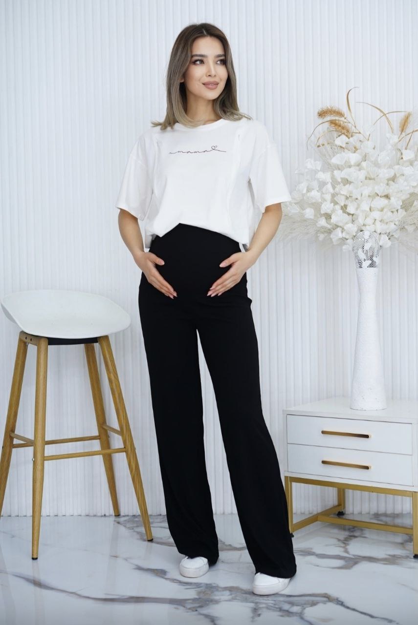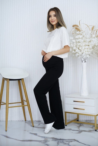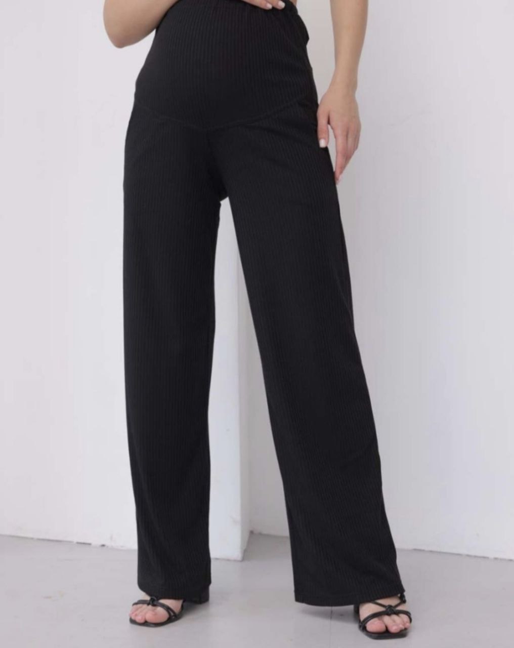 Актуальная новинка для будущих мам- брюки палаццо. Идеальный выбор для модных и уверенных в себе женщин. Брюки выполнены из легкого материала – лапши в рубчик. Этот материал создает приятное ощущение на коже и обеспечивает комфорт в жаркие дни. Брюки имеют свободный крой и низ в стиле клеш, что позволяет создать визуальный эффект длинных ног. Они смотрятся элегантно и привлекательно. Вы можете сочетать их с различными элементами гардероба. Брючки из хлопка – это прекрасный выбор для создания удобного модного стиля. Подойдут для различных мероприятий – от вечеринки до деловых встреч. Модные широкие штаны с эластичной вставкой на живот, можно носить на любом сроке беременности. Высокий трикотажный пояс-бандаж по объему регулируется перфорированной резинкой.