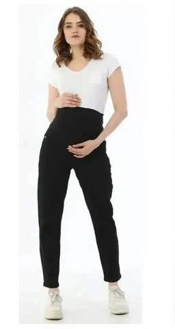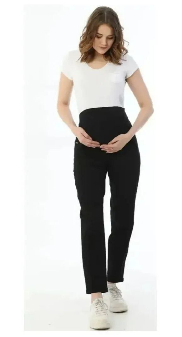 Черные джинсы для беременных в стиле МОМ, выполнены из ткани хлопок, с добавлением эластана, благодаря чему они хорошо тянутся и не стесняют движений, что особенно ценят все будущие мамы в период беременности.