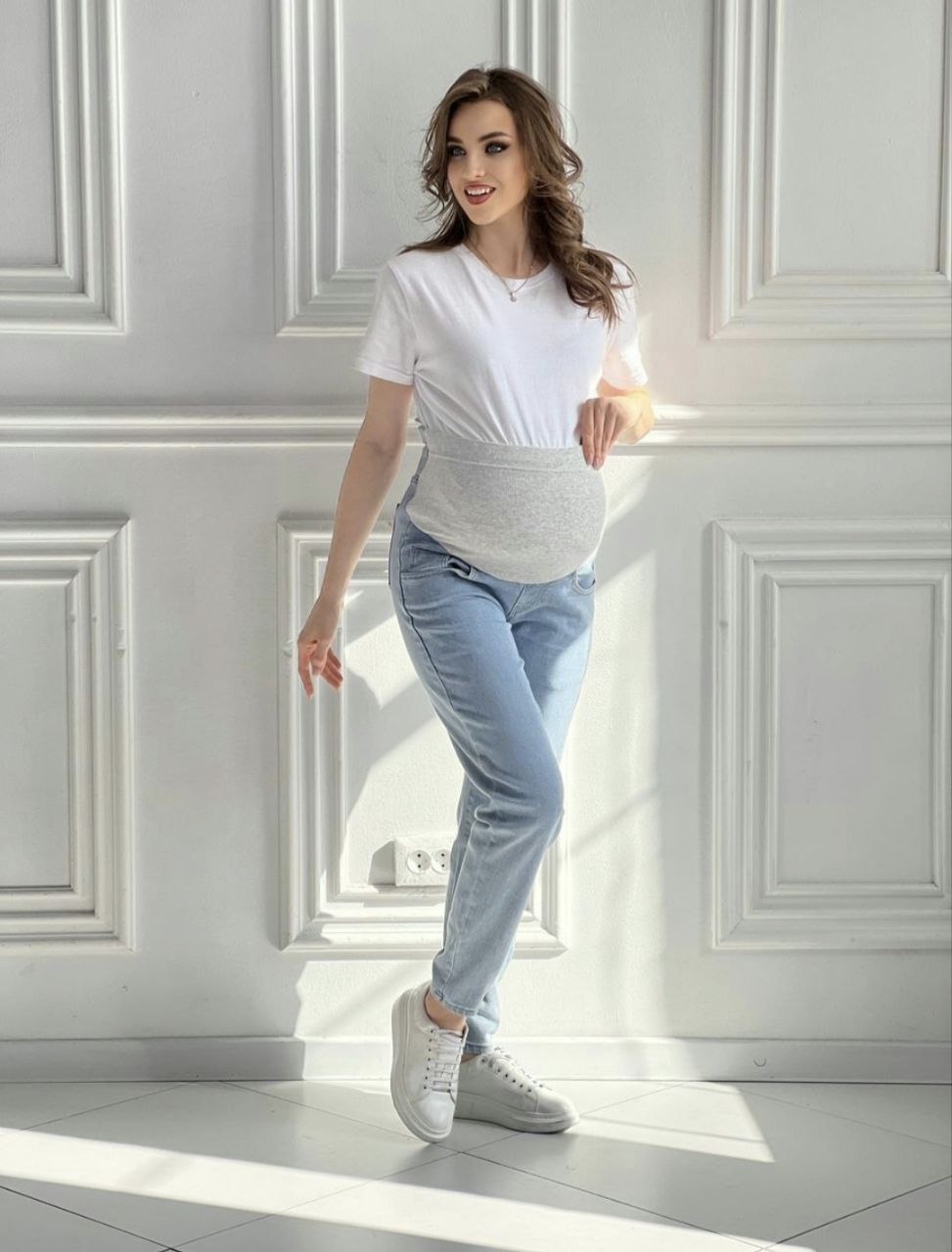 Голубые джинсы мом для беременных с высокой спинкой